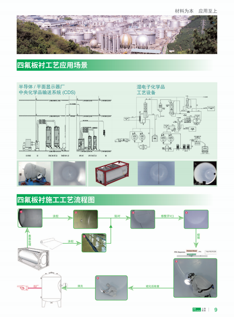 工艺介绍: 采用预先经过活化处理或粘合玻纤布的四氟板涂上粘结剂,同时对设备的钢壳进行Sa2级的喷砂和用清洁剂清洗的处理后,涂上粘结剂,然后将四氟板通过其独创的真空衬里技术粘结在钢体上,可抗负压,根据用户的不同使用需求,选用最佳的衬里材料和厚度。 技术不受制造设备大小的限制,同时也解决了化工行业、电子化学品行业对洁净、温度和耐腐蚀的三大难题,具有抗渗透性好,表面平整光亮,摩擦系数小,不易结垢,使用寿命长等特点。 板衬材料及特性: PTFE和PFA板材由知名板材加工商选用国内外知名氟塑料公司原料制造,板材表面光滑,均匀致密,厚度一致。 点击下方链接,查看完整版技术解决方案:
